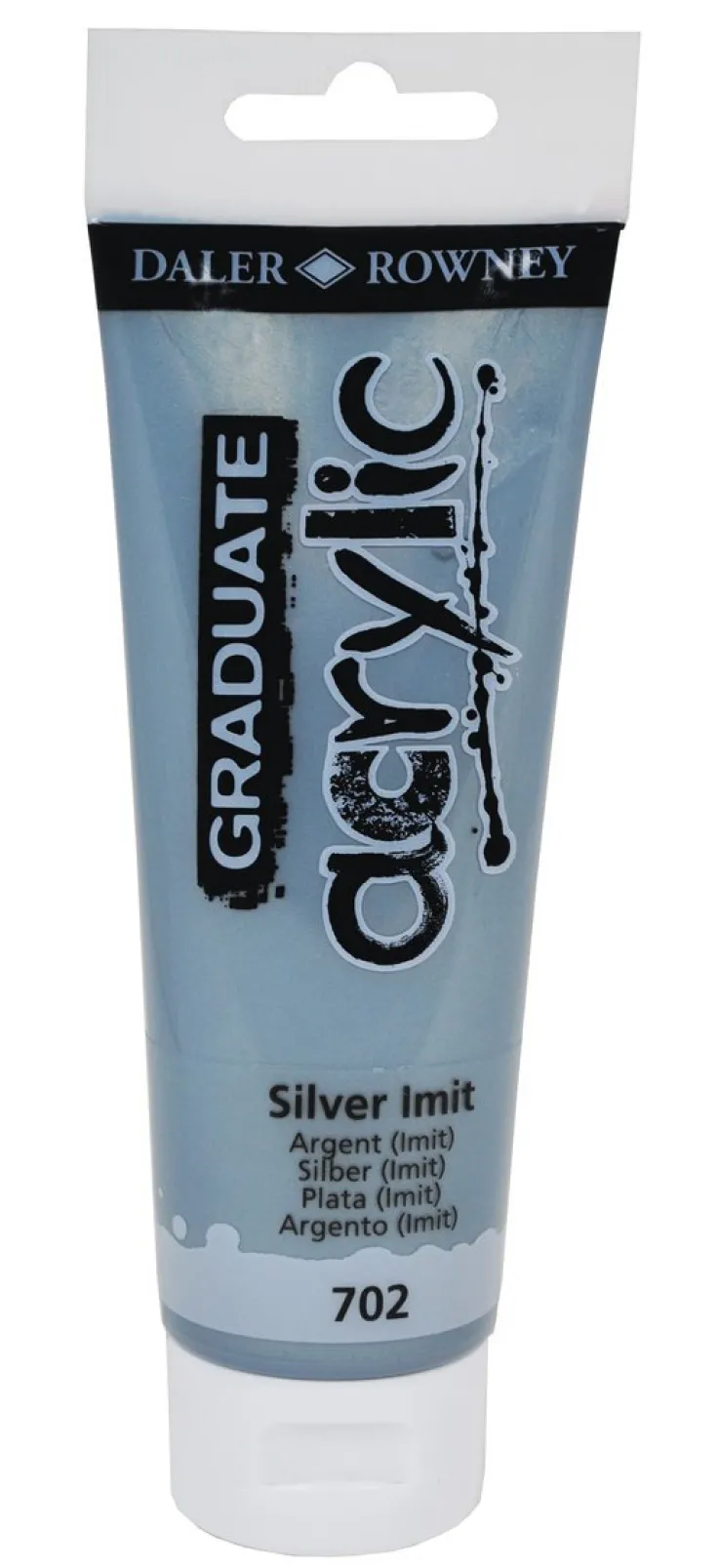 Akrylfärg Daler-Rowney Graduate 120 ml Silver Imit. Graduate Acrylic är en vattenbaserad akrylfärg till ett konkurrenskraftigt pris. Tillverkad och framtagen av Daler-Rowney i England. En snabbtorkande studioakrylfärg med klara & starka färger, god täckkraft och en utmärkt ljusäkthet. Mjuk och jämn konsistens gör den lättarbetad.