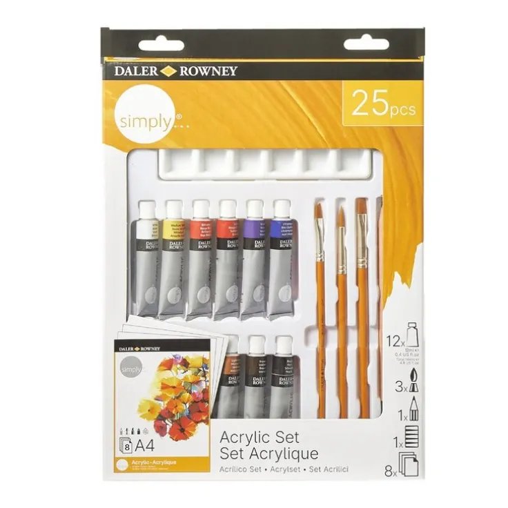 Prisvärt set från Daler-Rowney som innehåller det du behöver för att komma igång med akrylmålning. 12 tuber akrylfärg á 12 ml i följande kulörer: vit, medium gul, brilliantröd, scharlakansröd, violett, ultramarine, mörkgrön, mediumgrön, gul ockra, ljusbrun, brun och svart. Setet innehåller även 3 penslar i olika storlekar, en skisspenna, en plastpalett samt 8 pappersark för akrylmålning.
