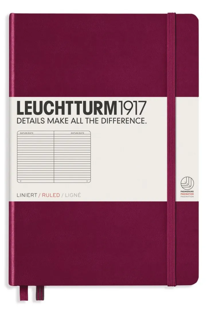 Leuchtturm1917 A5 är en trådbunden linjerad anteckningsbok med 251 sidor och ink-proof syrafritt 80 g/m2 papper. Längst bak finns en ficka för förvaring. Boken har två märkband och ett elastiskt band som håller ihop boken. Klistermärken för märkning och arkivering medföljer. Färg: Port Red