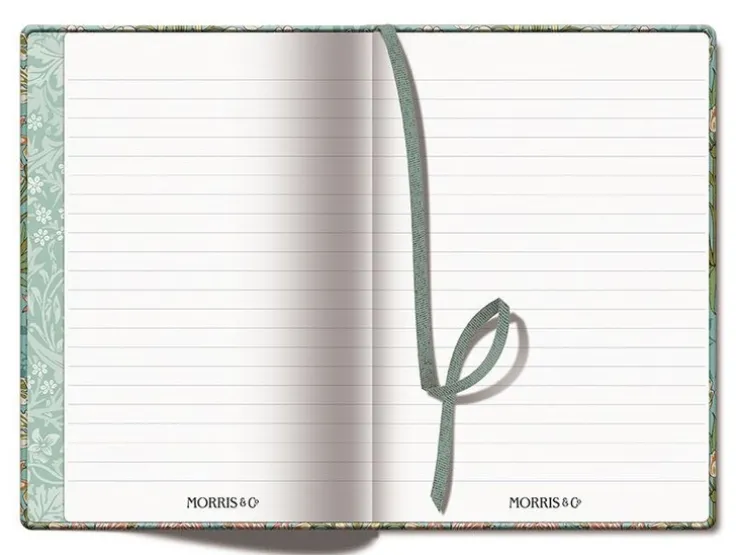 Inbunden anteckningsbok i A5 med linneeffekt på omslaget som är i hard cover. Innehåller 192 linjerade vita sidor i 100g papper som passar både blyerts och bläck. Anteckningsboken ligger platt uppslagen, vilket gör det både lätt och bekvämt att skriva i boken. Matchande sidmarkör gör att du hittar bland dina anteckningar på ett enkelt sätt. Boken stängs med ett matchande elastiskt band.Vackert mönster på omslaget av konstnären William Morris.