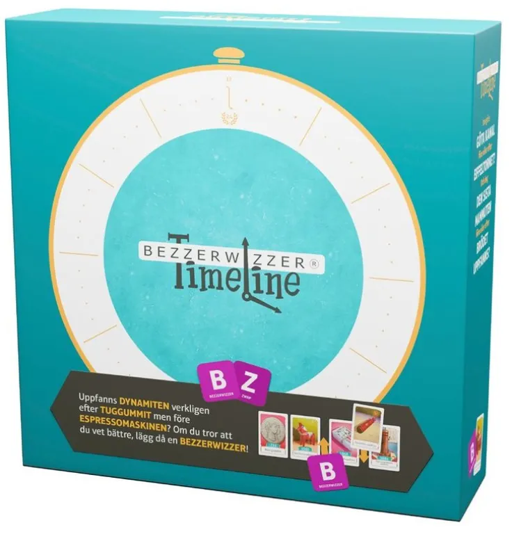 I BEZZERWIZZER Timeline ska ni placera historiska händelser i rätt kronologisk ordning. Det blir en resa genom historien där du ska använda kunskap och taktik för att lista ut om DYNAMITEN verkligen uppfanns efter TUGGUMMIT men före ESPRESSOMASKINEN. Dessutom kan du få extra poäng om du vet att en motståndare har lagt en händelse på fel plats, eller så kan du stjäla deras favorithändelser – men kom ihåg att de kan göra detsamma mot dig!