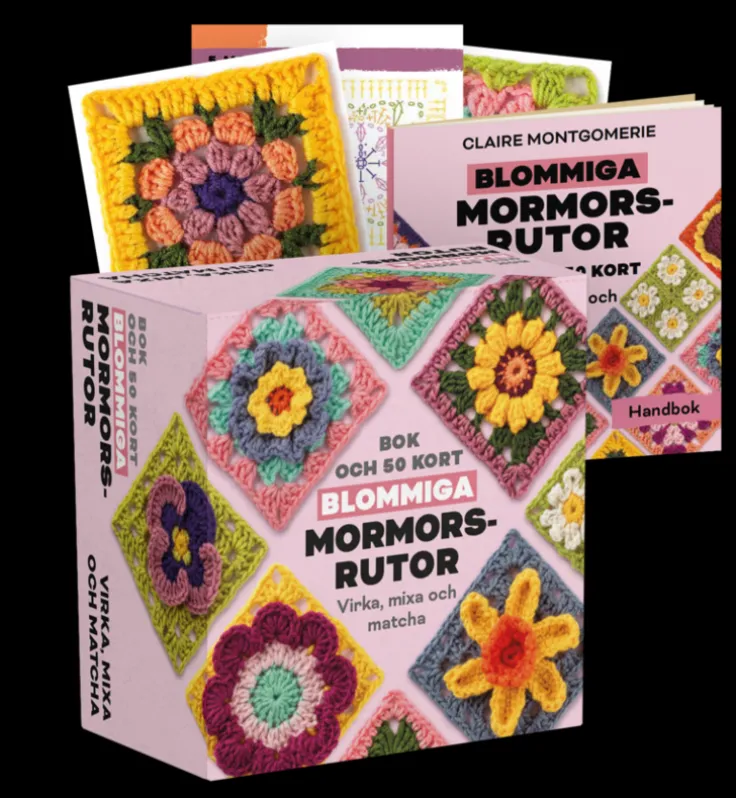 I lådan hittar du en grundläggande instruktionsbok som går igenom hur du läser virkdiagram, virkar i 3D, fäster rutor i varandra och matchar färgkombinationer.Du får även en kortlek med bilder på mormorsrutor och instruktioner till hur du virkar dem. Placera enkelt ut korten framför dig och mixa som du vill för att skapa en unik design.