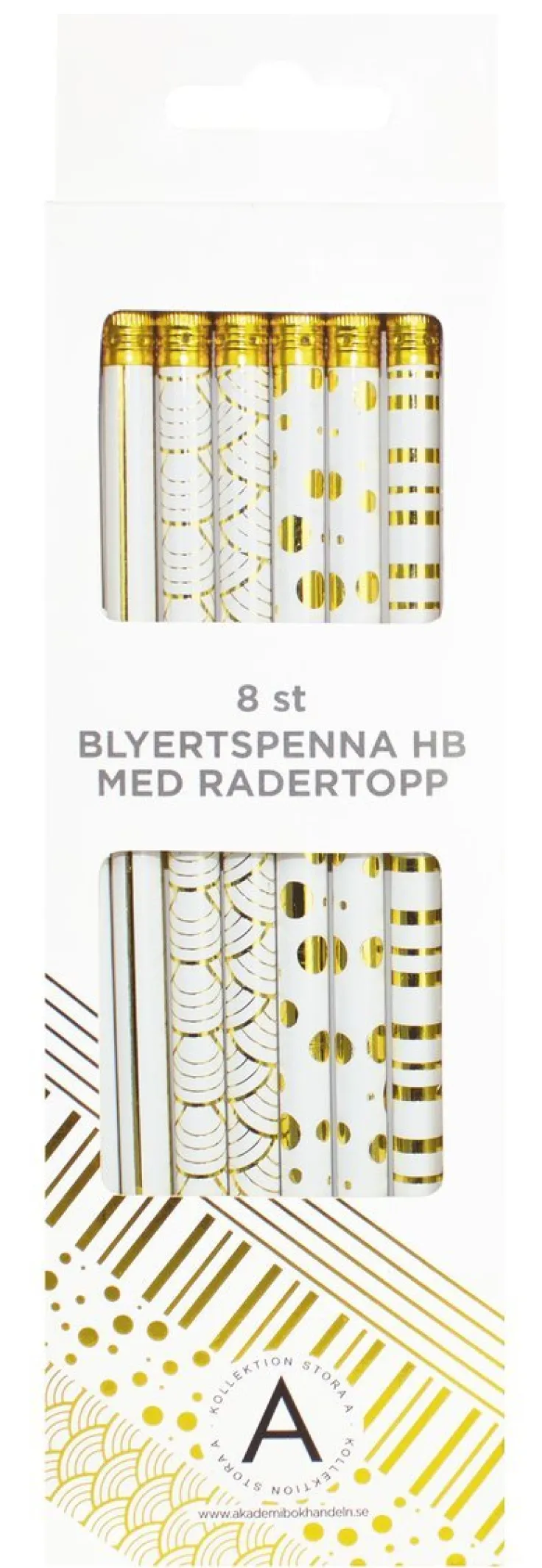 Ett eleganta set som innehåller 8 st blyertspennor med radertopp. Pennornas hårdhet är HB och pennkropparna har dekorativa mönster i guld. Pennorna som är ovässade vid leverans och är förpackade i en snyggt matchande förpackning. Blyertspennorna ingår i Akademibokhandelns egen kollektion – Kollektion Stora A.