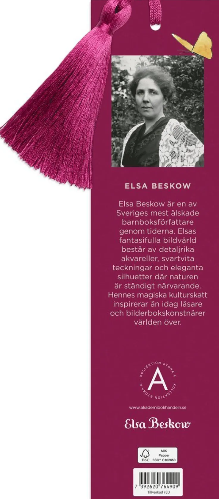 Ett ljuvligt bokmärke med tofs som gör din resa i böckernas värld ännu vackrare. Bokmärket har en vinröd bakgrund och motivet är hämtat ur Elsa Beskows bilderbok Blomsterfesten i täppan från 1914. En saga där trädgårdens alla blommor och växter anländer i en färgsprakande parad för att fira midsommar. Mått: 5×19 cm. 240 g papper. FSC®-märkt papper, ett bättre val för dig och vår världElsa Beskow är en av Sveriges mest älskade barnboksförfattare genom tiderna. Hon var en skicklig skribent och konstnär som väckte sina böcker till liv med vackra illustrationer. Elsas fantasifulla bildvärld består av detaljrika akvareller, svartvita teckningar och eleganta silhuetter där naturen är ständigt närvarande. Hennes magiska kulturskatt inspirerar än idag läsare och bilderbokskonstnärer världen över. Nu i ett unikt samarbete med Akademibokhandeln för vår egen kollektion – Kollektion Stora A.