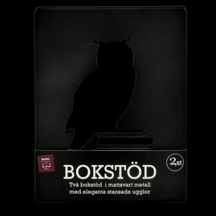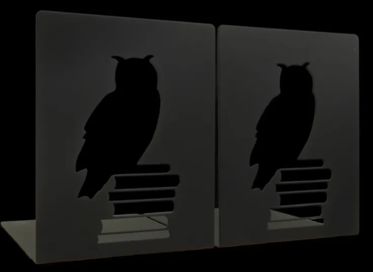 Bokstöd i metall i 2-pack. Stadiga med lång fot att ställa böckerna på. Utskuren uggla som motiv på stöden. Målade matt svarta. Fin dekoration i bokhyllan.