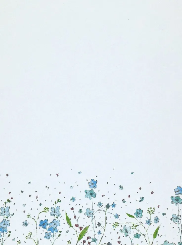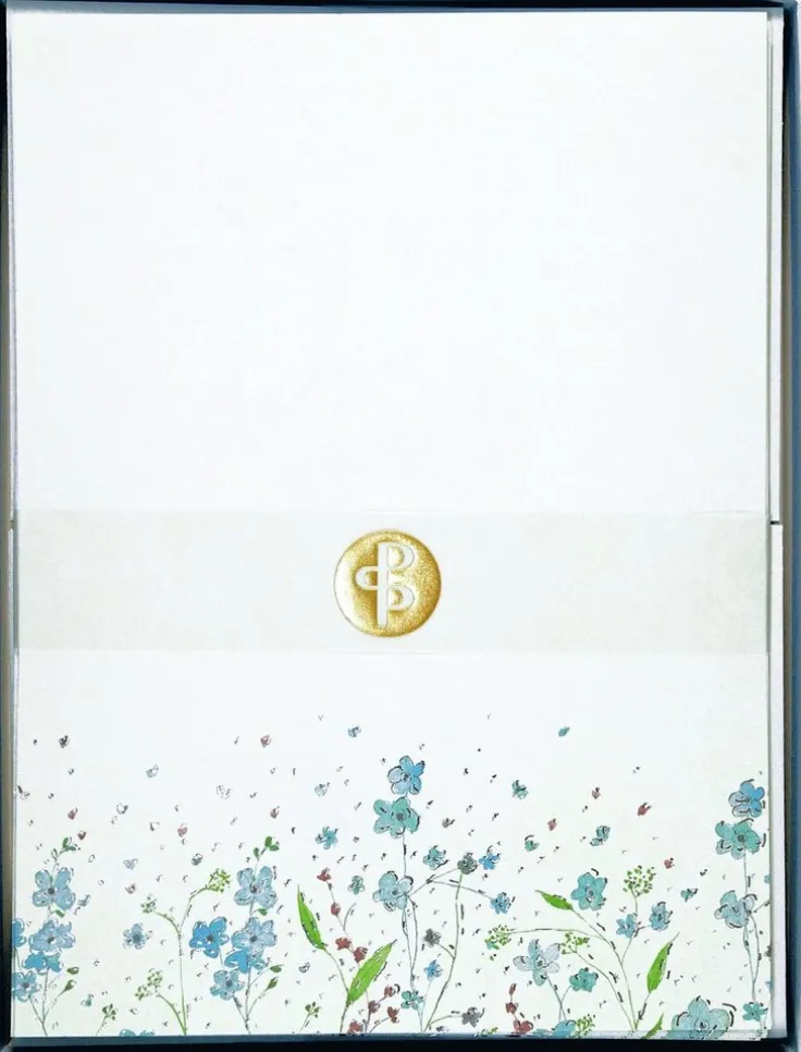 Fint brevpapper i stadig ask. 30st ljusblå pappersark dekorerade med vackra blommor, målade i akvarell, i nederkant och med silver folierade detaljer som förhöjer känslan av det fina brevpappret. 24st ljusblå kuvert med blommor på baksidans flik. Gör någon glad genom att skriva ett personligt brev!