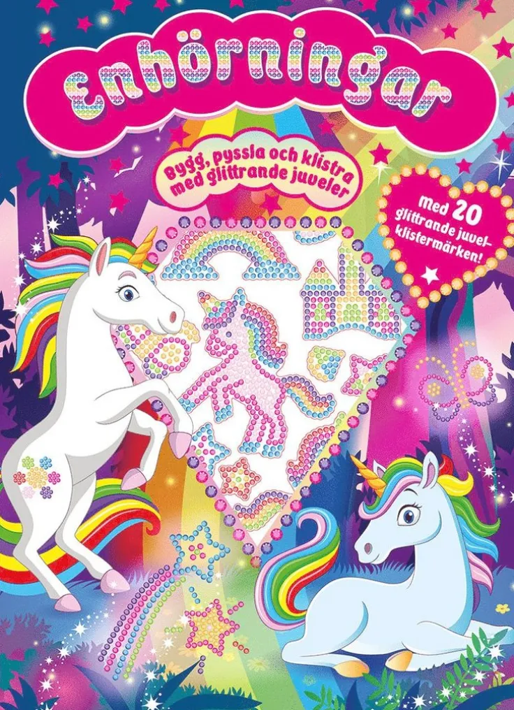 Kom igång med förtrollande pyssel! Para ihop dansande enhörningar, rita godsaker till älvornas picknick och tryck ut figurer till ditt eget magiska sagoland! Innehåller juvelklistermärken att pynta sidorna med.