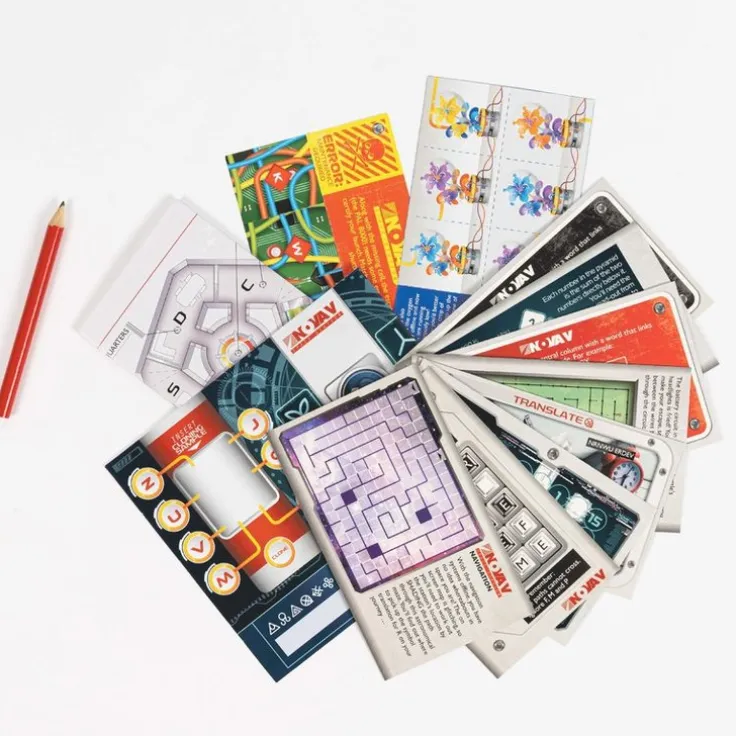 Ett mini escape room-spel utom denna värld … Det är inte varje dag du blir instängd på en rymdstation som rusar mot ett asteroidbälte. Och när stationen kastas ur kurs finns det ingen tid för panik! Ditt enda skott på säkerhet ligger med en lapp skriven med ett konstigt språk – det ser ut som om du måste ta på dig din intergalaktiska tankemössa! Det finns 12 olika pussel, från knepiga bildpussel till galna labyrinter, och lösningen för var och en kommer att översätta en enda bokstav på lappen. Först när alla 12 pussel har lösts korrekt och sedeln har avkodats, kommer du att kunna fly från rymdstationen!