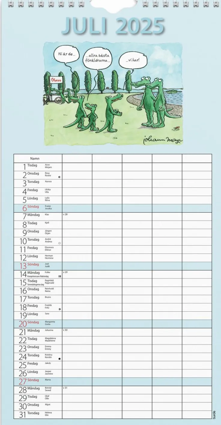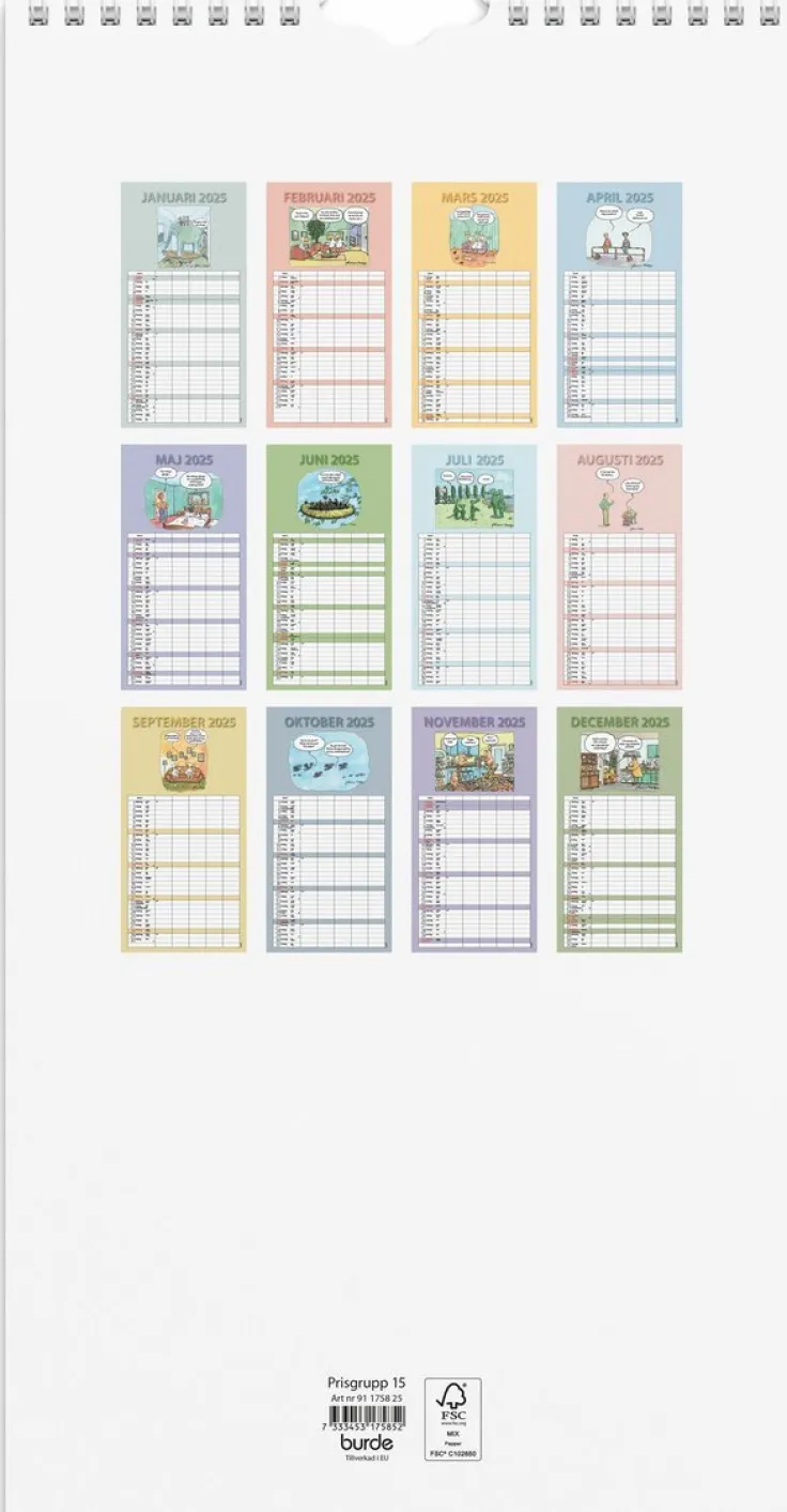 Familjekalender 2025 från Burde. Format: 220×430 mm. Layout: Månad/blad. Kalendarium: 2025-01-01 – 2025-12-31. Spiralbunden. Detaljer: Pappersficka. Innehåll: Fem kolumner. Antal sidor: 12. Miljöinformation: FSC®.