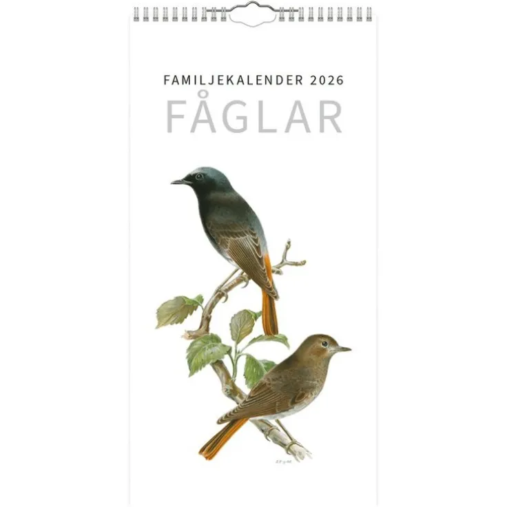 Familjekalender Fåglar 2026 med illustrationer av Magnus, Wilhelm och Ferdinand von Wright från mitten och slutet av 1800-talet. Kalendern har fem kolumner för familjens aktiviteter. Svenska namndagar och helgdagar. Kalendern är producerad och tryckt i Sverige på svenskt papper. Märkt med både Svanen och FSC.
