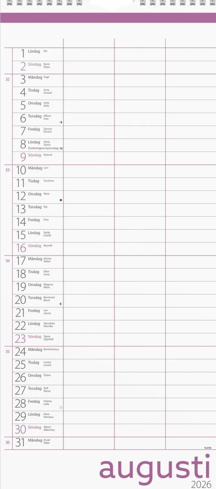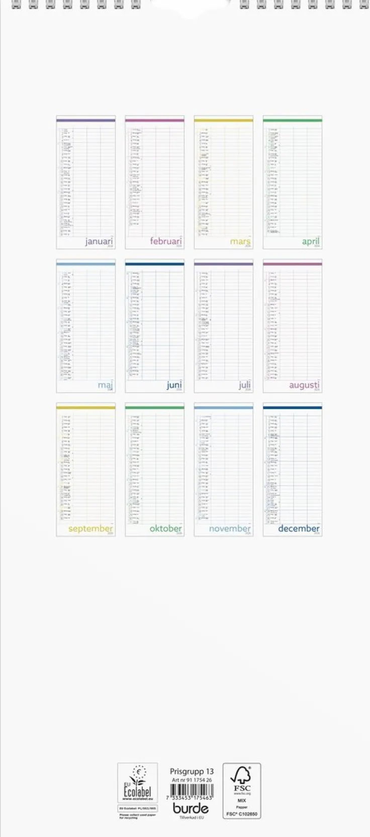 En vägghängd, gemensam familjekalender hjälper dig att frigöra tid för både familjemys och egentid. Kalendern är designad med en månad per sida, uppdelad i tre kolumner – perfekt för paret eller den lilla familjen. Gott om utrymme gör att alla planer får plats!>Familjekalender 2026 från Burde. Format: 190×430 mm. Layout: Månad/blad. Kalendarium: 2026-01-01 – 2026-12-31. Spiralbunden. Innehåll: Flaggdagar, helgdagar/aftnar, månfaser, namnsdagar, temadagar/händelser, 3 kolumner. Antal sidor: 12. Miljöinformation: FSC®. Ecolabel.