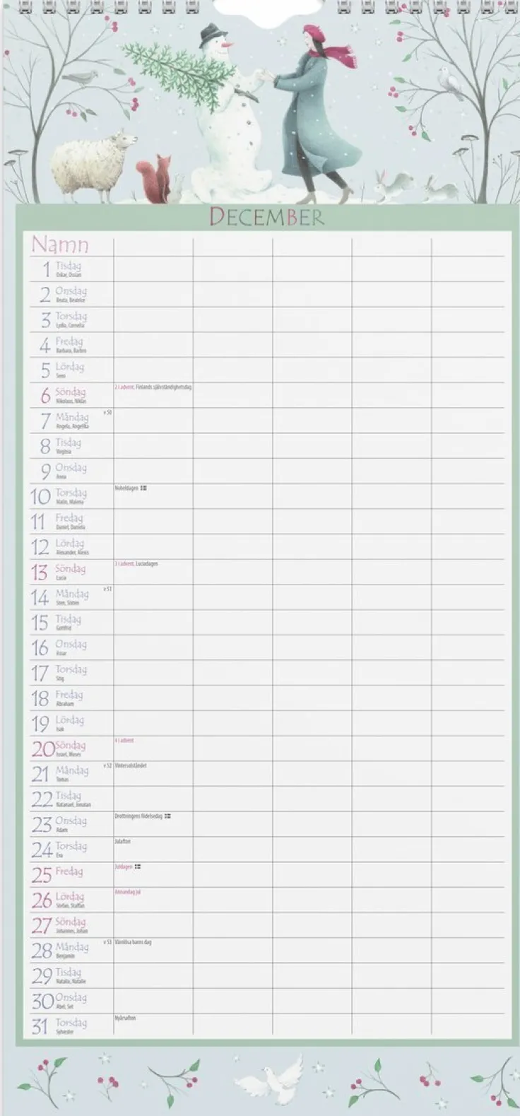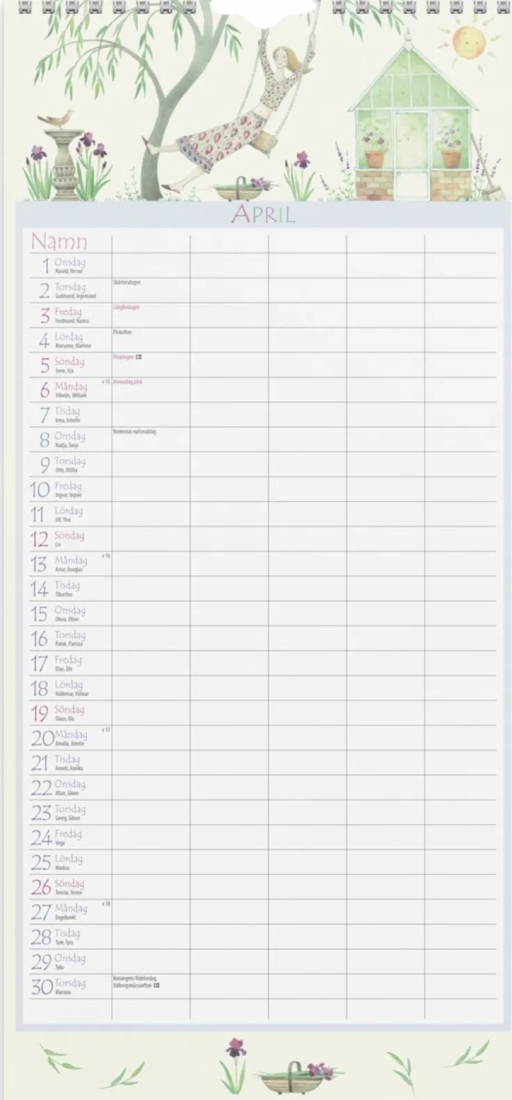 Väggkalendern har fem kolumner för anteckningar och bilder av Judith Glover.>Familjekalender 2026 från Burde. Format: 210×450 mm. Layout: Månad/blad. Kalendarium: 2026-01-01 – 2026-12-31. Spiralbunden. Innehåll: Flaggdagar, helgdagar/aftnar, namnsdagar, temadagar/händelser, 5 kolumner. Antal sidor: 12. Miljöinformation: FSC®. Ecolabel.