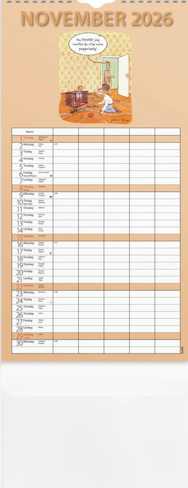 Familjekalender 2026 från Burde. Format: 220×430 mm. Layout: Månad/blad. Kalendarium: 2026-01-01 – 2026-12-31. Spiralbunden. Detaljer: Pappersficka. Innehåll: Flaggdagar, helgdagar/aftnar, månfaser, namnsdagar, temadagar/händelser, 5 kolumner. Antal sidor: 12. Miljöinformation: FSC®.
