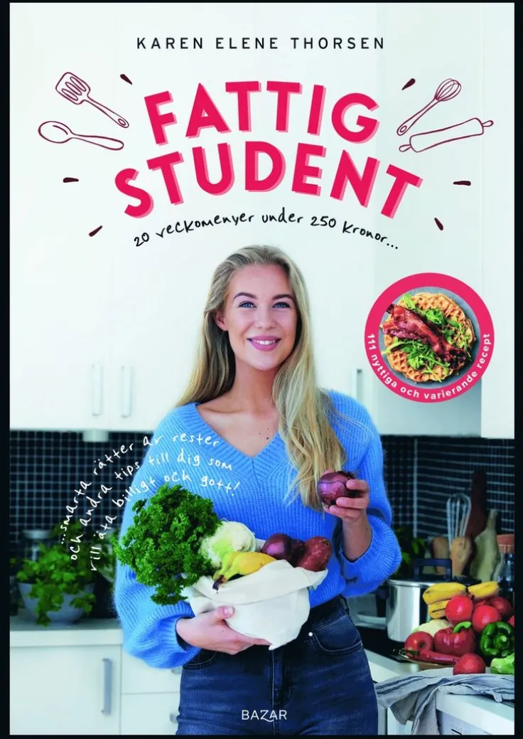 I denna roliga och användbara kokbok hittar du 20 av de bästa veckomenyerna från den norska försäljningssuccén och instagramkontot fattigstudent. Ingen av menyerna kostar över 250 kronor, och innehåller allt du behöver för en balanserad kosthållning. Dessutom innehåller boken inköpslistor med billiga basvaror, tips för att undvika matsvinn och massor av andra råd för dig som vill vara både ekonomisk och mätt och belåten.