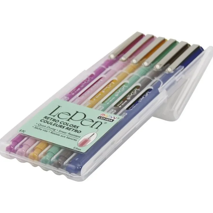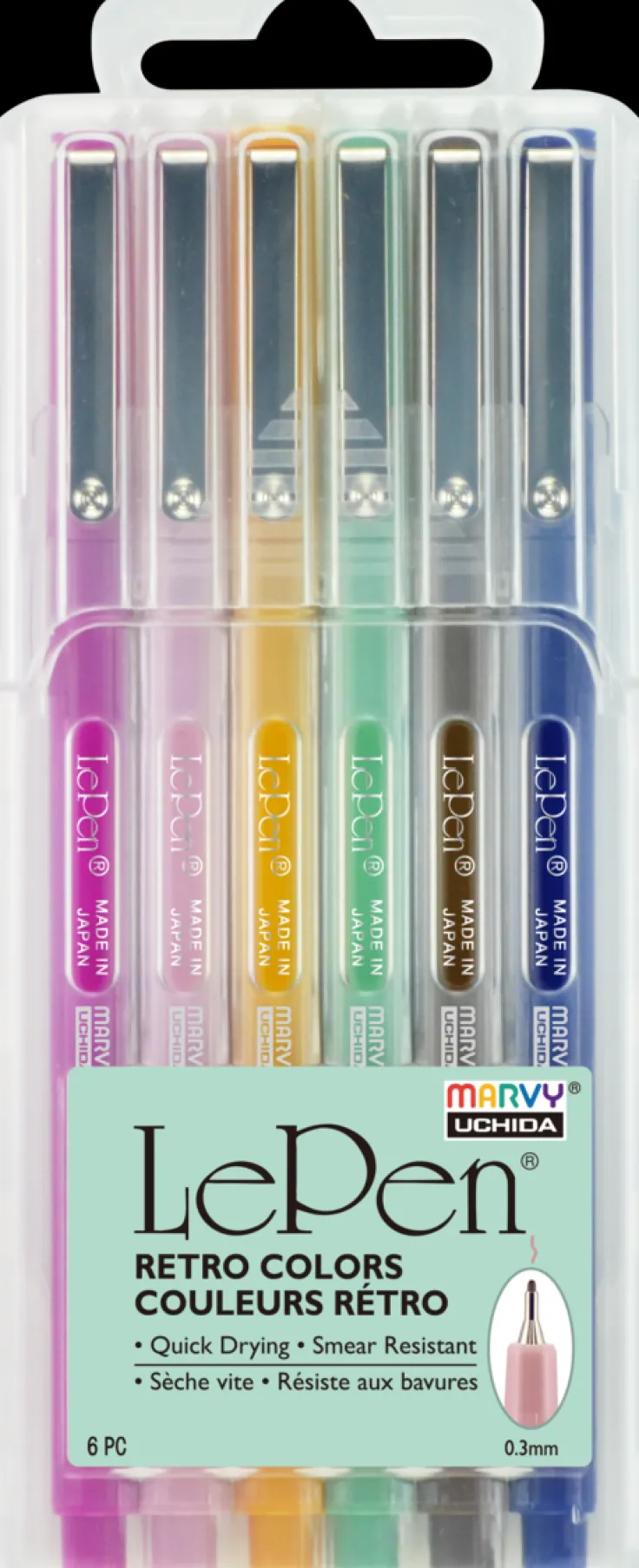 LePen från Japanska Marvy Uchida med den släta mikrofina plastspetsen möjliggör exakt noggrannhet, vilket gör detta till en av de bästa pennorna för en bullet journal. Denna exakta penna är perfekt för att fylla i viktiga formulär, scrapbooking, för användning i kalendern eller brev. Bläcket är syrafritt och giftfritt. Detta set innehåller 6 underbara retro-färger. Den smarta förpackningen fungerar utöver som förvaring och skydd, även som ett praktiskt ställ på skrivbordet.