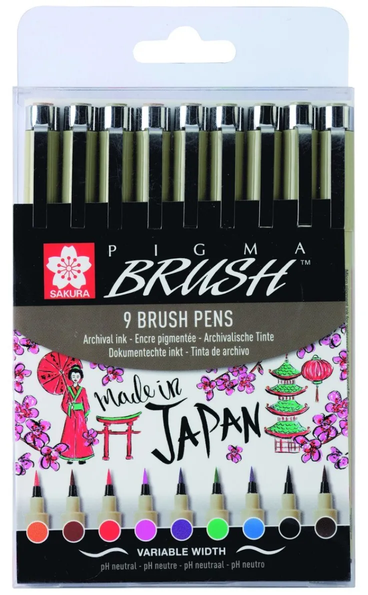 Pigma Brush är en teckningspenna med en flexibel penselspets som ger möjlighet till såväl fina detaljer som breda penseldrag, ljusbeständig, arkivsäker och blöder ej igenom papper. Set med 9 olika färger.