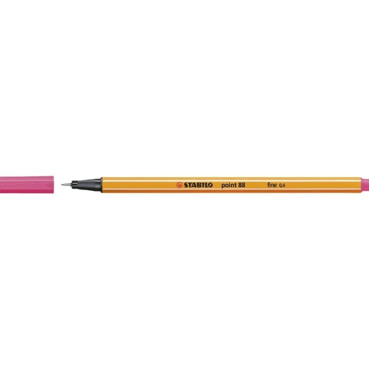 STABILO point 88 fineliner. Det är den enda finelinern som finns i så många som 47 olika färger. Skrivspetsen är metallomsluten för en längre livslängd för pennan. Med STABILO point 88 skrivs tunna fina linjer utan risk för att färgen smetas ut. Pennan är sexkantigt utformad med en lång ”cap off” tid och ventilerad huv och har en pennspets på 0,4 mm.