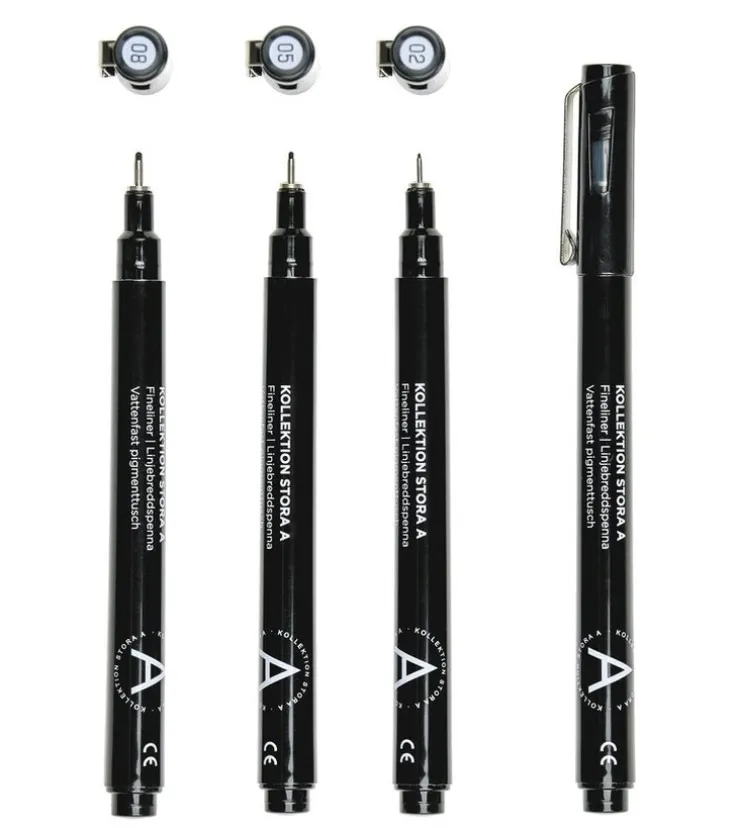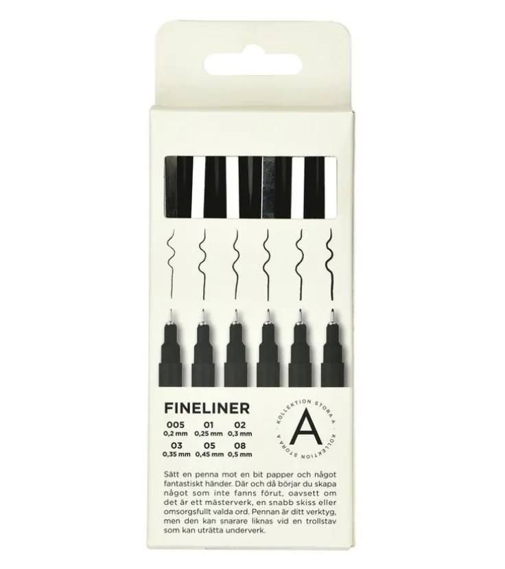 Tack vare den tunna spetsen är dessa fineliners perfekta för detaljerade illustrationer, exakta linjer och fina texter. Passar såväl hobbykonstnärer som erfarna tecknare. Pennorna ingår i Akademibokhandelns egen kollektion – Kollektion Stora A.