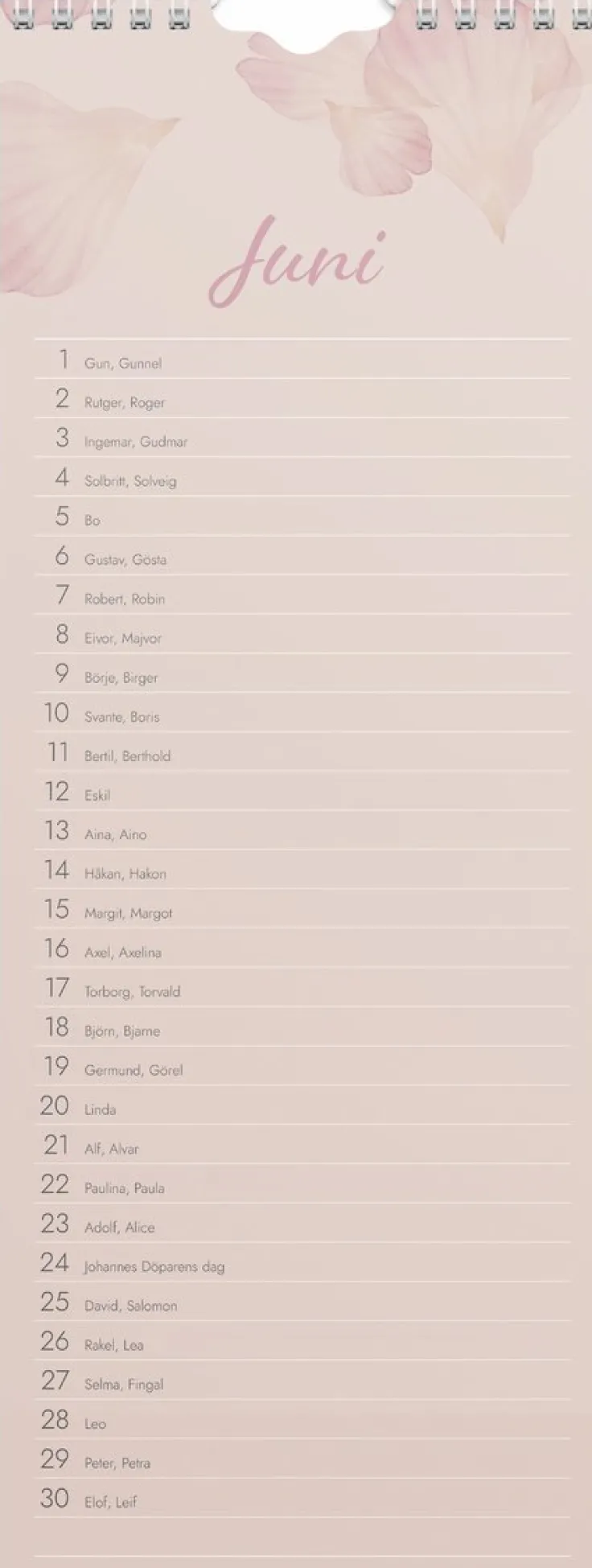 En odaterad kalender som kan hänga på väggen år efter år som ett komplement till den dagliga planeringen. Kalendern är ett perfekt ställe att fylla i vem som fyller år eller andra minnesvärda dagar som firas med nära och kära. Med en kolumn och odaterade månadsblad så är det enkelt att skriva upp speciella återkommande dagar. Väggkalendern innehåller också svenska namnsdagar.Format: 120×315 mm. Layout: Månad/blad. Spiralbunden. Innehåll: Namnsdagar. Antal sidor: 12. Pappersvikt: 170 g. Miljöinformation: FSC®. Varumärke: Burde.