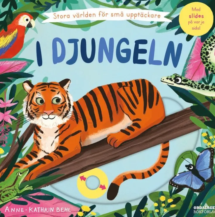 Rolig bok för små djurälskare! En härlig bok för de minsta med robusta slides som tål ivriga barnhänder. Upptäck stora världen! Vad gömmer sig i djungeln? Dra i fliken och se den smygande tigern …