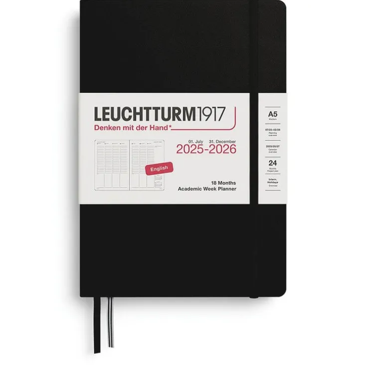 Kalender 2025-2026 Leuchtturm A5 Vecka/Uppslag vertikal 18mån svart