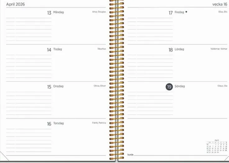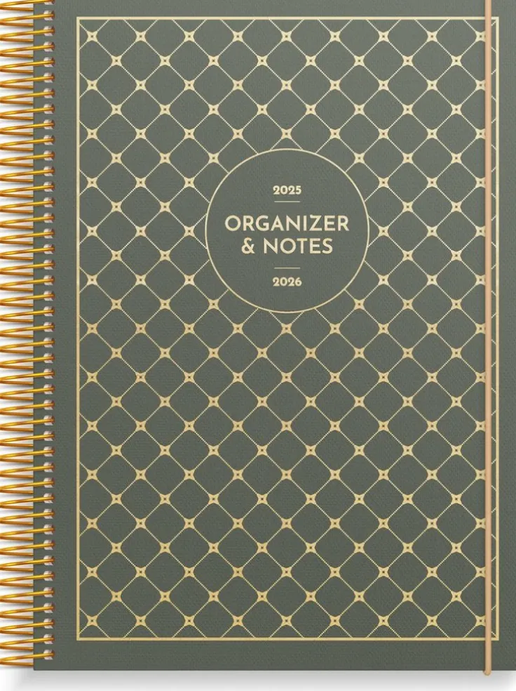 En kalender och anteckningsbok i ett! Första halvan innehåller ett kalendarium med vertikal veckolayout, medan andra halvan är linjerade sidor för dina listor och anteckningar. Med hjälp av de flyttbara flikarna förflyttar du dig smidigt mellan veckoplanering och anteckningar. Perfekt som komplement till digital planering. Kalendern har en vacker grön kulör med stilrena dekorationer i guld.Kalender 25/26 från Burde. Format: A5. Layout: Stående. Vecka/uppslag. Kalendarium: 2025-06-02 – 2026-07-12. Omslag: Kartong med struktur. Spiralbunden. Detaljer: Gummiband. Flyttbara plastmarkörer. Innehåll: Anteckningssidor, Årsöversikter, Årsplaner. Antal sidor: 256. Miljöinformation: FSC®.