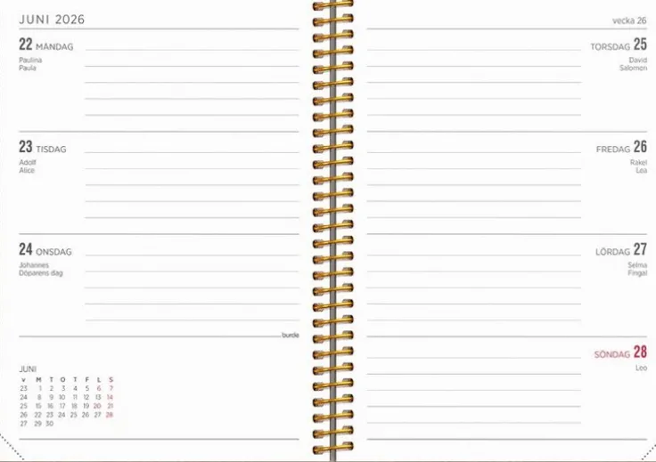 Senator A6 har en klassiskt liggande layout där fokus ligger på en enkel veckoplanering. Med årsöversikt och månadsplanering blir senator A6 ett perfekt verktyg för dig som har mycket på gång eller som ett analogt komplement till dina tekniska lösningar. Check-listor och mindre anteckningsmöjligheter ingår också, liksom en praktisk förvaringsficka. Kommer även i ett större A5 format.Omslaget Twist Mocca är i en sammetsmjuk skinnimitation med en användbar flärp som kan fungera som bokmärke för att enkelt förflytta dig i kalendern. Kalender 25/26 från Burde. Format: A6. Layout: Liggande. Vecka/uppslag. Kalendarium: 2025-06-02 – 2026-07-05. Omslag: Konstläder. Spiralbunden. Innehåll: Årsöversikter, Årsplaner. Antal sidor: 144. Miljöinformation: FSC® papper.