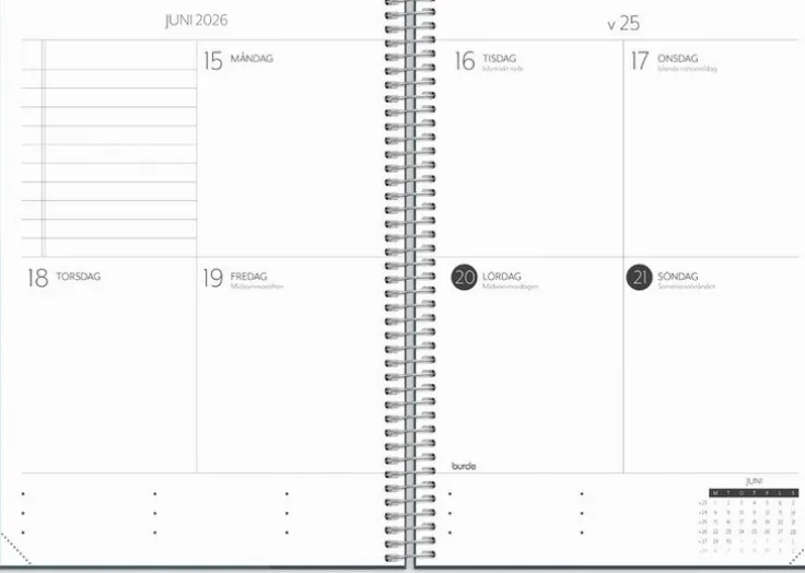 Första steget ut i vuxenlivet är ofta kantat av nya erfarenheter kring eget ansvar för hem, studier, jobb och fritidsaktiviteter. Student planner är för dig som uppskattar att kunna planera din vardag och hålla ordning på ditt studentliv. Kalendern kan med fördel användas som en bullet journal, där du har gott om möjligheter att skapa dina egna listor och sätta färg på din dagliga planering. Skriv ner veckans planer, gör en budget, håll koll på dina provresultat, anteckna drömmar om framtiden och få överblick över dina månader. Allt du behöver för ett härligare liv som student!Kalender 25/26 från Burde. Format: A5. Layout: Stående. Vecka/uppslag. Kalendarium: 2025-06-09 – 2026-06-28. Omslag: Kartong med struktur. Spiralbunden. Detaljer: Gummiband. Pappersficka. Innehåll: Läsårsöversikt, Kurslitteratur, Viktiga datum, Månadsplanering, Anteckningssidor, Schema, Provresultat, Resor, Årsöversikter, Årsplaner. Antal sidor: 176. Miljöinformation: FSC®.