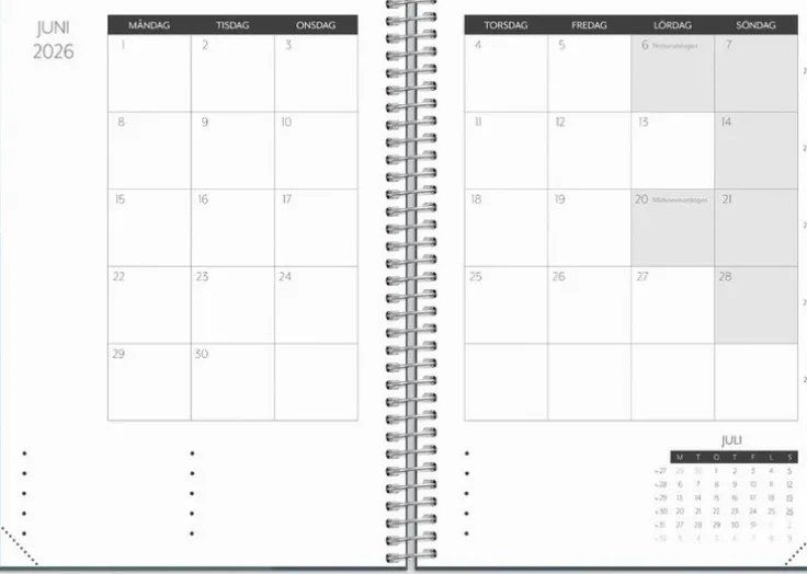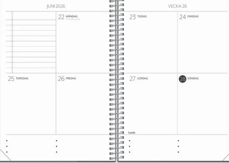Första steget ut i vuxenlivet är ofta kantat av nya erfarenheter kring eget ansvar för hem, studier, jobb och fritidsaktiviteter. Student planner är för dig som uppskattar att kunna planera din vardag och hålla ordning på ditt studentliv. Kalendern kan med fördel användas som en bullet journal, där du har gott om möjligheter att skapa dina egna listor och sätta färg på din dagliga planering. Skriv ner veckans planer, gör en budget, håll koll på dina provresultat, anteckna drömmar om framtiden och få överblick över dina månader. Allt du behöver för ett härligare liv som student! A6 storleken är i en mindre fickstorlek, om en större variant önskas kommer Student Planner även i ett A5 format.Kalender 25/26 från Burde. Format: A6. Layout: Stående. Vecka/uppslag. Kalendarium: 2025-06-02 – 2026-07-12. Omslag: Kartong med struktur. Spiralbunden. Detaljer: Gummiband. Innehåll: Läsårsöversikt, Kurslitteratur, Viktiga datum, Månadsplanering, Anteckningssidor, Schema, Provresultat, Resor, Årsöversikter, Årsplaner. Antal sidor: 176. Miljöinformation: FSC®.