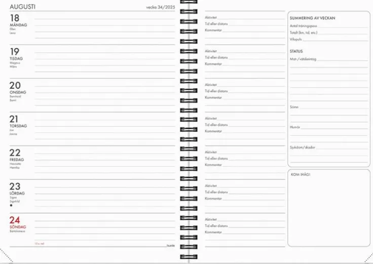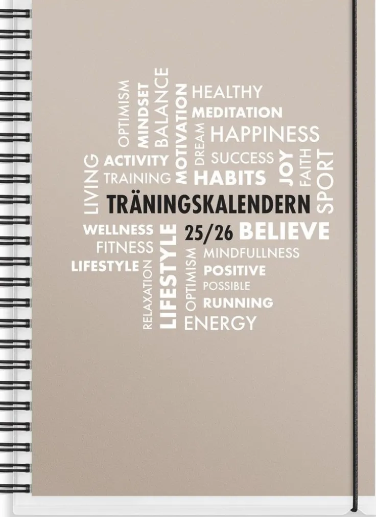 Träningskalendern hjälper dig att få sunda vanor i din vardag, men även att behålla dem över tid. Kalendern passar dig som vill ha en allsidig träning med en kombination av löpning och styrketräning. Det ingår även ett program för dig som vill komma i gång med meditation och andningsövningar. Båda programmen är signerade löpcoachen och PT:n Jenny Sunding. Jenny ger också hälsosamma tips som håller inspirationen vid liv hela året. På varje uppslag finns dels en kalendersida med veckoplanering och dels en aktivitetssida. Träningskalendern har ett funktionellt plastomslag för att kunna följa med dig på träningspassen och även två framsidor att växla mellan.Kalender 25/26 från Burde. Format: A5. Layout: Stående. Vecka/uppslag. Kalendarium: 2025-06-30 – 2026-07-19. Omslag: PP-plast. Spiralbunden. Detaljer: Gummiband. Innehåll: Årsplaner. Antal sidor: 160. Miljöinformation: FSC®.