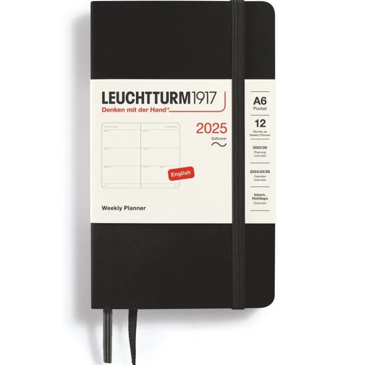Kalender 2025 Leuchtturm1917 i A6-format med mjuk pärm, Weekly Planner med en hel vecka på ett uppslag. Kraftig förvaringsficka längst bak. Dubbla märkband. Informationssidor med bl a internationella helgdagar i 58 länder, vilket gör det lätt att hitta helgdagar i sitt eget land, praktiskt även vid planering av resor. Projektplaneringsblad. Perforerade avrivningsbara sidor för anteckning. Praktisk resårsnodd som håller ihop kalendern. FSC-certifierat papper. Färg: Black