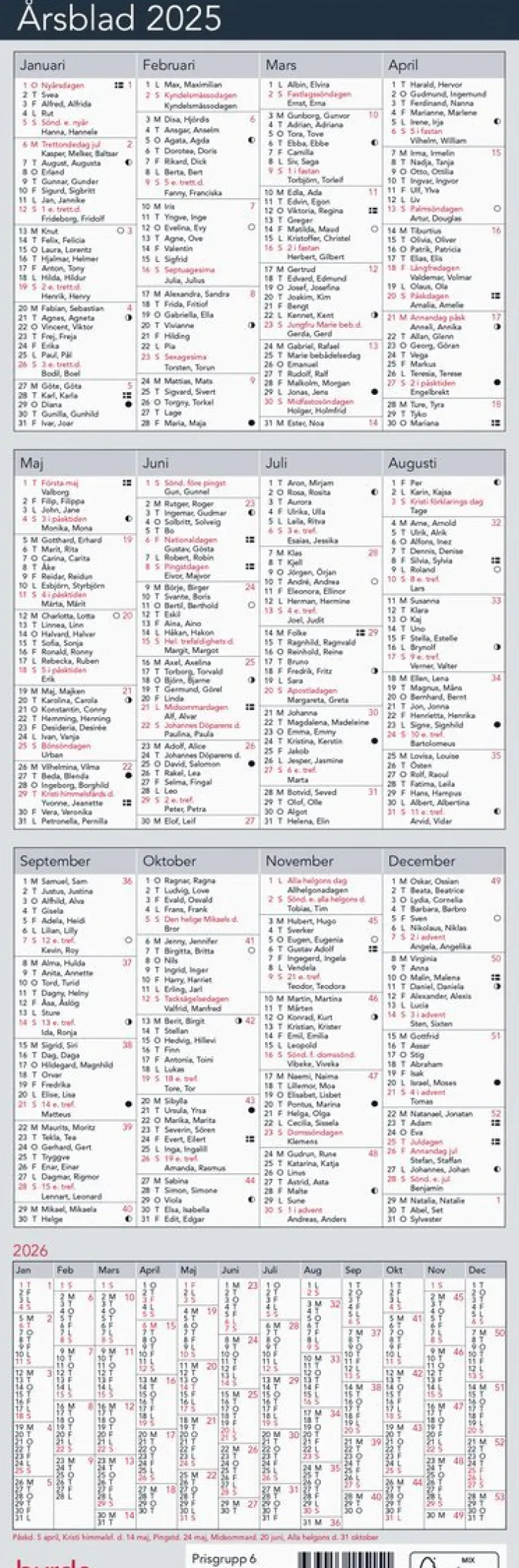 Kalender 2025 från Burde. Format: 120×366 mm. Layout: År/blad. Kalendarium: 2025-01-01 – 2025-12-31. Innehåll: Namnsdagar, årsöversikter för föregående, innevarande och de tre följande åren. Antal sidor: 2. Miljöinformation: FSC®.