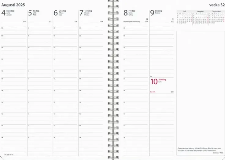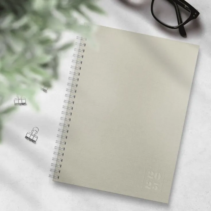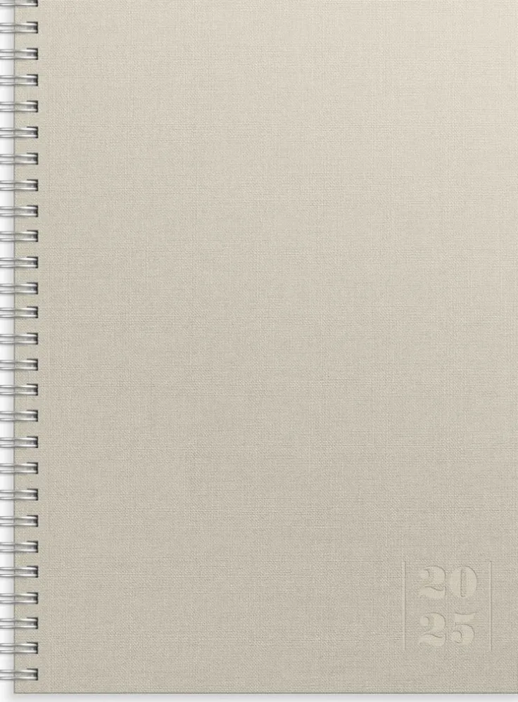 Detta textilomslag med det präglade årtalet ger ett stilrent och elegant intryck som passar året om. Att ha flyt på jobbet handlar till stor del om konsten att planera. Det här är kalendern för dig som vet att arbetsdagen lätt blir hektiskt och snabbt fylls på med möten och uppgifter, och vill ha bra översikt över din veckoplanering. När du vet vad som väntar varje dag blir du mer effektiv och chansen är större att du når dina karriärmål. Kalendern har även en praktisk förvaringsficka och tänkvärda citat.Kalender 2025 från Burde. Format: A5. Layout: Stående. Vecka/uppslag. Timindelning 8-18. Kalendarium: 2024-11-25 – 2026-01-04. Omslag: Linnetextil. Spiralbunden. Detaljer: Pappersficka. Innehåll: Årsöversikter, årsplaner, internationella helgdagar. Antal sidor: 128. Miljöinformation: FSC®. FSC® papper.