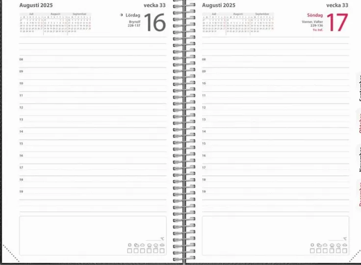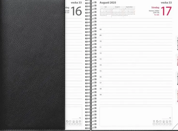 Kalender med mjuk pärm i konstläder med den populära flärpen som kan användas som bokmärke. Burdes Dagbok har en dag per sida med timindelning 08-19 vilket gör att den passar både för detaljerad planering och dagboksanteckningar. Genom att sortera dina tankar kan du lära dig mer om dig själv, få enklare att hitta lösningar på problem och dessutom bättra på minnet.Kalender 2025 från Burde. Format: 135×205 mm. Layout: Dag/sida. Timindelning 8-19. Kalendarium: 2025-01-01 – 2025-12-31. Omslag: Konstläder. Spiralbunden. Innehåll: Årsplaner, urstansat månadsregister. Antal sidor: 400. Miljöinformation: FSC® papper.
