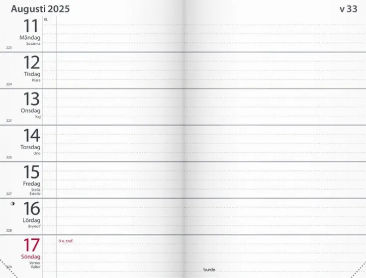 Kalender 2025 från Burde. Format: 82×127 mm. Layout: Liggande. Vecka/uppslag. Kalendarium: 2024-12-16 – 2026-01-04. Omslag: Konstläder. Inbunden. Innehåll: Årsöversikter, årsplaner, löst telefonregister, atlas. Antal sidor: 168. Miljöinformation: FSC®.