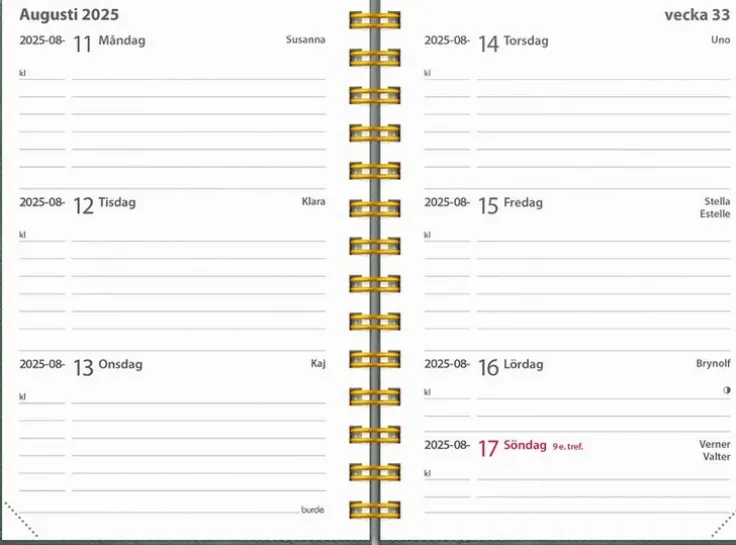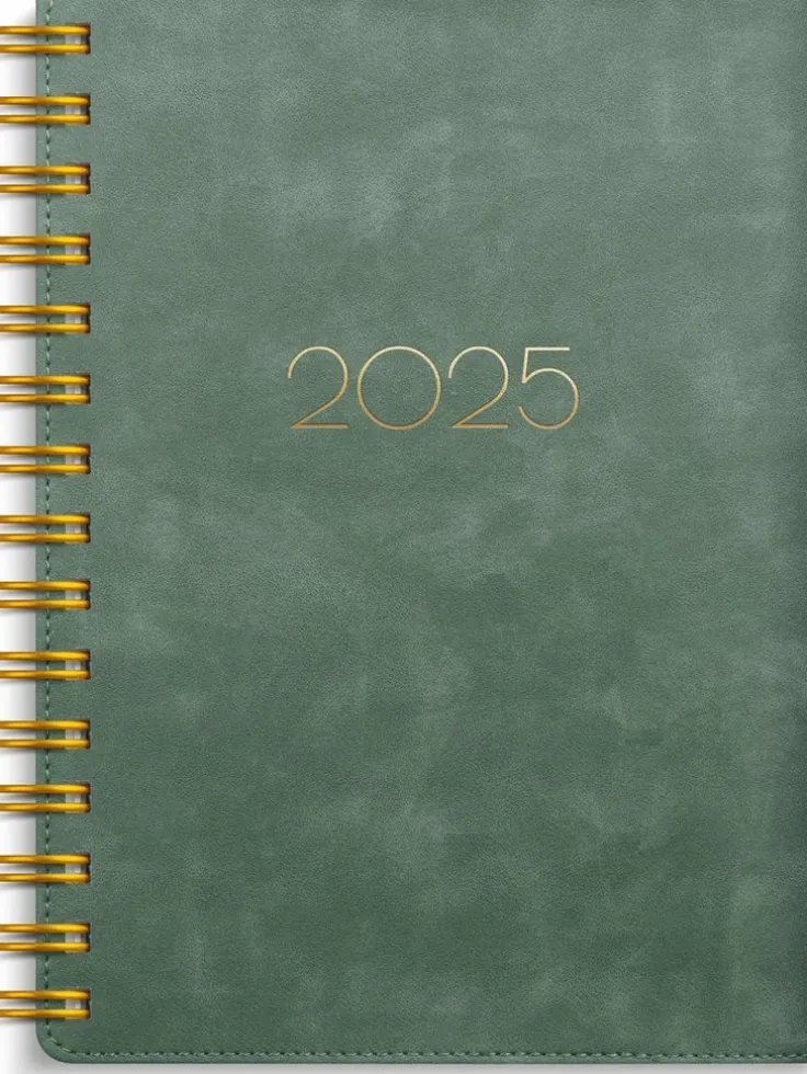 Kalender med mjuk pärm i konstläder med den populära flärpen som kan användas som bokmärke. Den lilla praktiska veckokalendern!Kalender 2025 från Burde. Format: 82×127 mm. Layout: Liggande. Vecka/uppslag. Kalendarium: 2024-12-16 – 2026-01-04. Omslag: Konstläder. Spiralbunden. Innehåll: Årsöversikter, årsplaner, atlas. Antal sidor: 128. Miljöinformation: FSC® papper.