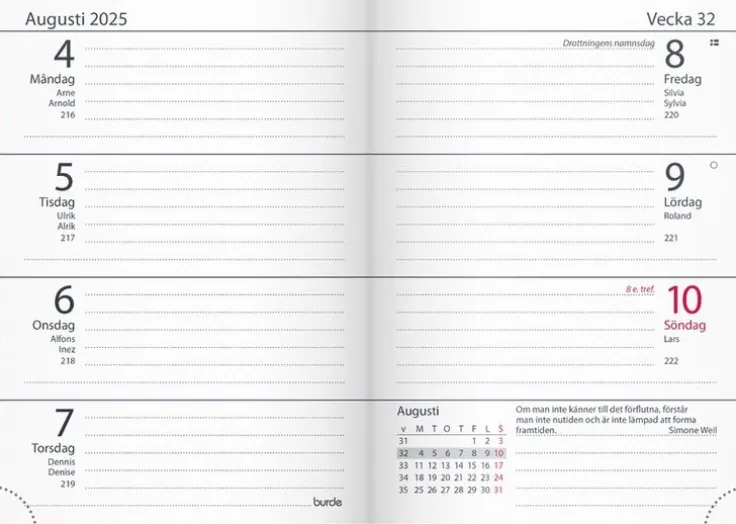 Kalender i smakfullt omslag med textillik struktur.Kalender 2025 från Burde. Format: 70×100 mm. Layout: Liggande. Vecka/uppslag. Kalendarium: 2024-12-23 – 2026-01-04. Omslag: Konstläder. Inbunden. Detaljer: Märkband. Innehåll: Årsöversikt, årsplan, telefonregister, atlas. Antal sidor: 160. Miljöinformation: FSC®.