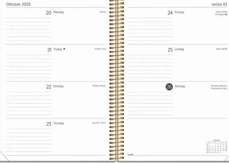 En kalender och anteckningsbok i ett! Med Organizer & Notes får du gott om utrymme att planera varje dag. Första halvan innehåller kalendarium och andra halvan innehåller linjerade sidor för din planering, kom ihåg, listor och anteckningar. Med hjälp av de flyttbara flikarna förflyttar du dig snabbt och smidigt mellan veckoplanering och anteckningar. När du har allt på samma ställe minskar stressen och du kan lägga fokus på annat.Kalender 2025 från Burde. Format: A5. Layout: Liggande. Vecka/uppslag. Kalendarium: 2024-12-09 – 2026-01-04. Omslag: Kartong med struktur. Spiralbunden. Detaljer: Gummiband. Flyttbara markörer. Innehåll: Årsöversikter, årsplaner. Antal sidor: 256. Miljöinformation: FSC®.