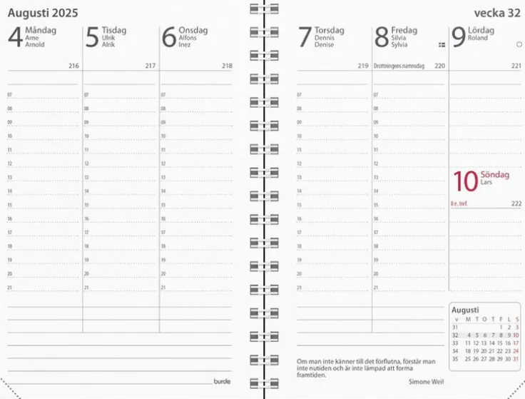 Kalender 2025 från Burde. Format: 83×127 mm. Layout: Stående. Vecka/uppslag. Timindelning 7-21. Kalendarium: 2024-12-09 – 2026-01-04. Omslag: Konstläder. Spiralbunden. Innehåll: Årsöversikter, årsplaner, telefonregister, atlas. Antal sidor: 152. Miljöinformation: FSC®.