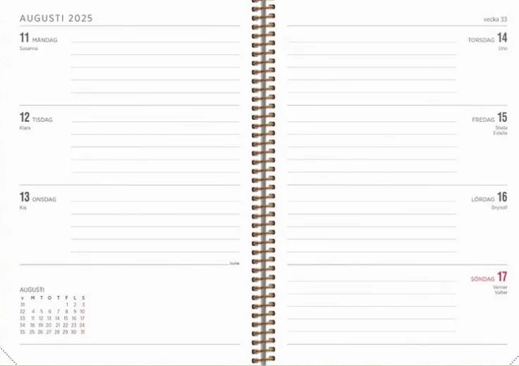 Kalender med mjuk pärm i konstläder med den populära flärpen som kan användas som bokmärke. Kalendern har ett uppslag med liggande layout där fokus ligger på tydlig veckoplanering. Inlagans layout passar dig som har mycket på gång, oavsett veckodag. Kalendern är enkel och tydlig med lika mycket utrymme för både vardag och helg.Kalender 2025 från Burde. Format: A5. Layout: Liggande. Vecka/uppslag. Kalendarium: 2024-12-09 – 2026-01-04. Omslag: Konstläder. Spiralbunden. Innehåll: Årsöversikter, årsplaner. Antal sidor: 144. Miljöinformation: FSC® papper.