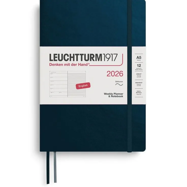 Kalender 2026 Leuchtturm1917 i A5-format med inbunden inlaga och mjuk pärm, Weekly Planner & Notebook med veckans dagar på vänster sida och prickat anteckningsblad på den högra sidan av ett uppslag – kalender och anteckningsbok i ett med gott om utrymme för daglig planering och organisering. Innehåller detaljer som 3 års årsöversikt, årsplanering 2026 & 2027, projektplanering, , kraftig förvaringsficka och avrivningsbara sidor längst bak, 2 märkband, internationella helgdagar vilket gör det lätt att hitta helgdagar i sitt eget land, praktiskt även vid planering av resor. Praktisk resårsnodd som håller ihop kalendern. FSC-certifierat och syrafritt papper. Färg: Deep Sea