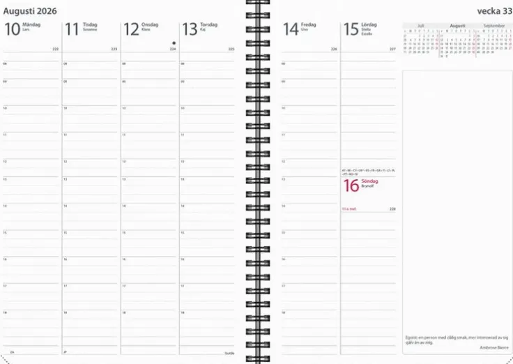 Kalender 2026 från Burde. Format: A5. Layout: Stående. Vecka/uppslag. Timindelning 8-18. Kalendarium: 2025-11-24 – 2027-01-03. Omslag: Konstläder. Spiralbunden. Innehåll: Kyrkliga helgdagar, flaggdagar, helgdagar/aftnar, internationella helgdagar, månfaser, namnsdagar, internationella helgdagar översikt, temadagar/händelser, årsöversikt/årsöversikter, årsplan/årsplaner,. Antal sidor: 144. Miljöinformation: FSC®.