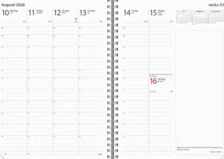 Detta textilomslag med det präglade årtalet ger ett stilrent och elegant intryck som passar året om. Att ha flyt på jobbet handlar till stor del om konsten att planera. Det här är kalendern för dig som vet att arbetsdagen lätt blir hektiskt och snabbt fylls på med möten och uppgifter, och vill ha bra översikt över din veckoplanering. När du vet vad som väntar varje dag blir du mer effektiv och chansen är större att du når dina karriärmål. Kalendern har även en praktisk förvaringsficka och tänkvärda citat.>Kalender 2026 från Burde. Format: A5. Layout: Stående. Vecka/uppslag. Timindelning 8-18. Kalendarium: 2025-11-24 – 2027-01-03. Omslag: Linnetextil. Spiralbunden. Detaljer: Pappersficka. Innehåll: Kyrkliga helgdagar, flaggdagar, helgdagar/aftnar, internationella helgdagar, månfaser, namnsdagar, internationella helgdagar översikt, temadagar/händelser, årsöversikt/årsöversikter, årsplan/årsplaner,. Antal sidor: 144. Miljöinformation: FSC®.