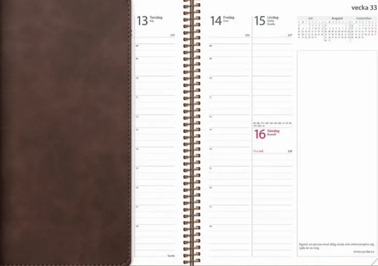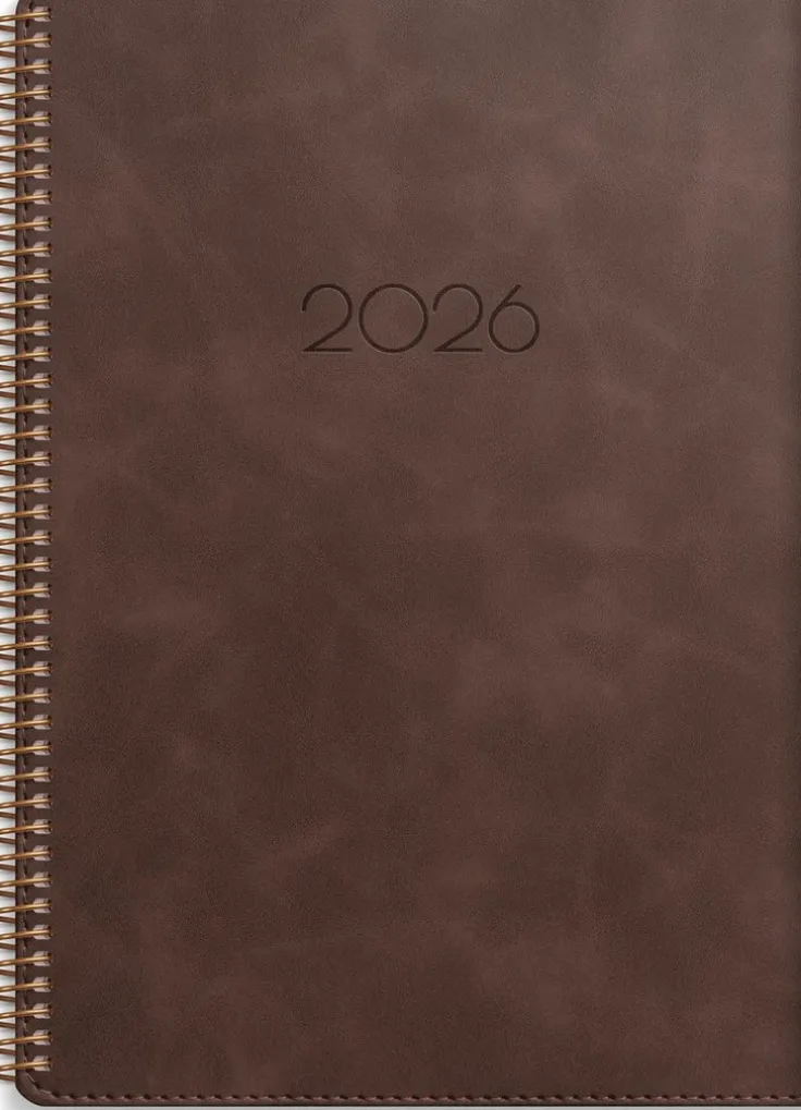 Kalender med mjuk pärm i konstläder med den populära flärpen som kan användas som bokmärke. Att ha flyt på jobbet handlar till stor del om konsten att planera. Det här är kalendern för dig som vet att arbetsdagen lätt blir hektiskt och snabbt fylls på med möten och uppgifter, och vill ha bra översikt över din veckoplanering. När du vet vad som väntar varje dag blir du mer effektiv och chansen är större att du når dina karriärmål.>Kalender 2026 från Burde. Format: A5. Layout: Stående. Vecka/uppslag. Kalendarium: 2025-11-24 – 2027-01-03. Omslag: Konstläder. Spiralbunden. Innehåll: Kyrkliga helgdagar, flaggdagar, helgdagar/aftnar, internationella helgdagar, månfaser, namnsdagar, internationella helgdagar översikt, temadagar/händelser, årsöversikt/årsöversikter, årsplan/årsplaner,. Antal sidor: 144. Miljöinformation: FSC® papper.