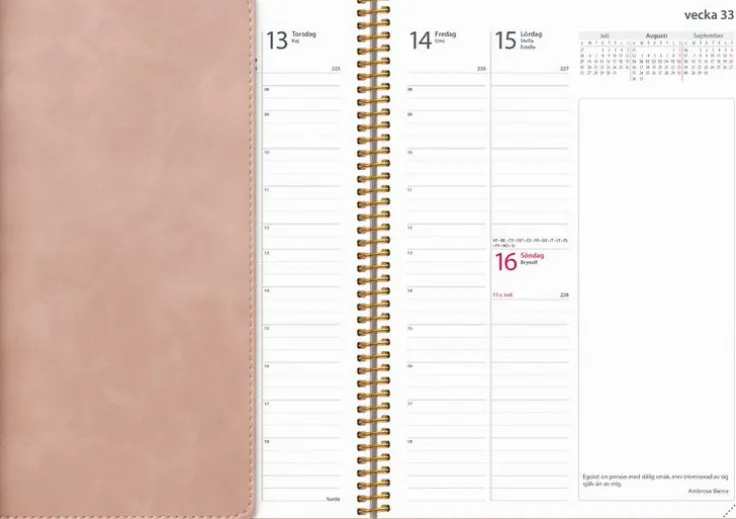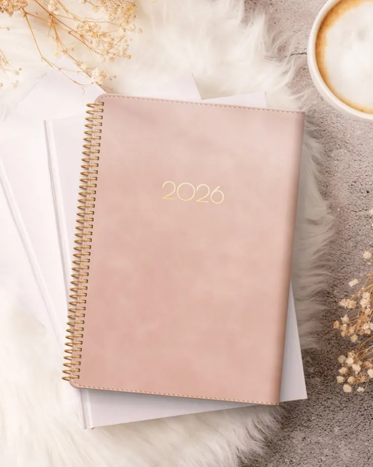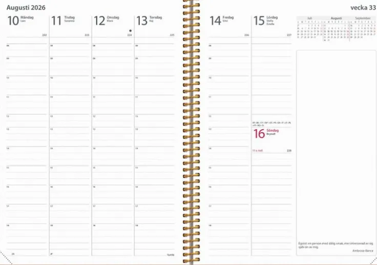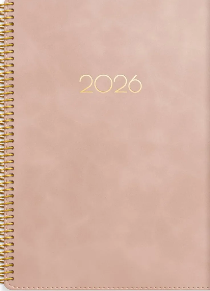 Kalender med mjuk pärm i konstläder med den populära flärpen som kan användas som bokmärke. Att ha flyt på jobbet handlar till stor del om konsten att planera. Det här är kalendern för dig som vet att arbetsdagen lätt blir hektiskt och snabbt fylls på med möten och uppgifter, och vill ha bra översikt över din veckoplanering. När du vet vad som väntar varje dag blir du mer effektiv och chansen är större att du når dina karriärmål.>Kalender 2026 från Burde. Format: A5. Layout: Stående. Vecka/uppslag. Timindelning 8-18. Kalendarium: 2025-11-24 – 2027-01-03. Omslag: Konstläder. Spiralbunden. Innehåll: Kyrkliga helgdagar, flaggdagar, helgdagar/aftnar, internationella helgdagar, månfaser, namnsdagar, internationella helgdagar översikt, temadagar/händelser, årsöversikt/årsöversikter, årsplan/årsplaner,. Antal sidor: 144. Miljöinformation: FSC® papper.