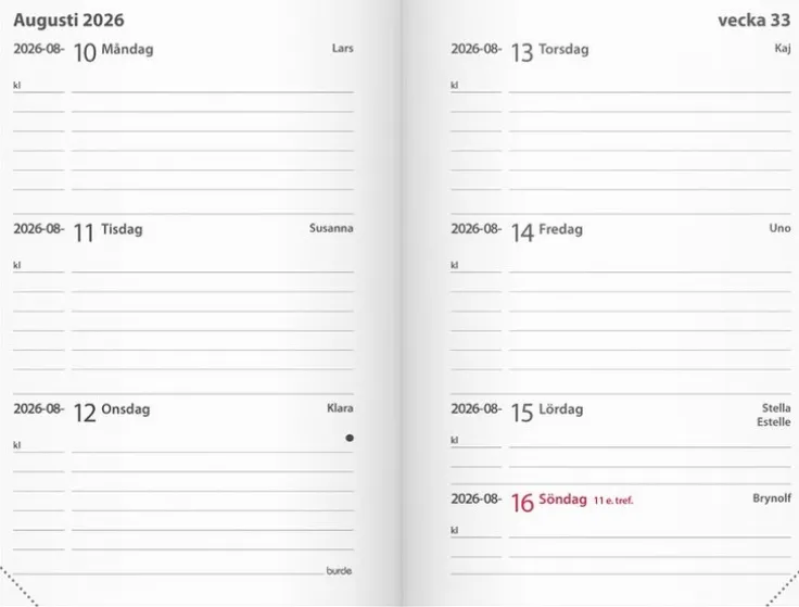 Kalender 2026 från Burde. Format: 83×127 mm. Layout: Liggande. Vecka/uppslag. Kalendarium: 2025-12-15 – 2027-01-03. Omslag: Konstläder. Inbunden. Innehåll: Kyrkliga helgdagar, flaggdagar, helgdagar/aftnar, månfaser, namnsdagar, internationella helgdagar översikt, temadagar/händelser, årsöversikt/årsöversikter, årsplan/årsplaner, atlas, telefonregister. Antal sidor: 184. Miljöinformation: FSC®.