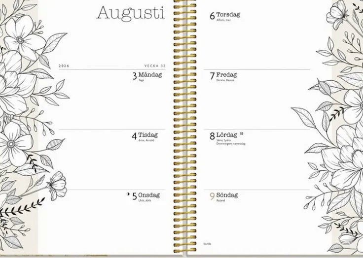 En kalender med en smakfull och romantisk inlaga, med handritade blomsterillustrationer. Välj att behålla den dämpade färgskalan eller själv sätta färg på den. Life Planner Bloom har ett tjockare papper för att förhindra att pennor blöder igenom till nästa sida. Veckouppslag samt månadsuppslag med plats för planering och anteckningar. Årsöversikt och extrasidor med kom ihåg-listor samt anteckningssidor.>Kalender 2026 från Burde. Format: A5. Layout: Liggande. Vecka/uppslag. Kalendarium: 2025-12-15 – 2027-01-03. Omslag: Kartong med struktur. Spiralbunden. Detaljer: Flyttbar plastlinjal. Pappersficka. Innehåll: Flaggdagar, helgdagar/aftnar, månfaser, namnsdagar, temadagar/händelser, årsöversikt/årsöversikter, årsplan/årsplaner, årsöversikter innevarande och följande år, checklistor, månads- och veckoplanering, anteckningssidor. Antal sidor: 160. Miljöinformation: FSC®.