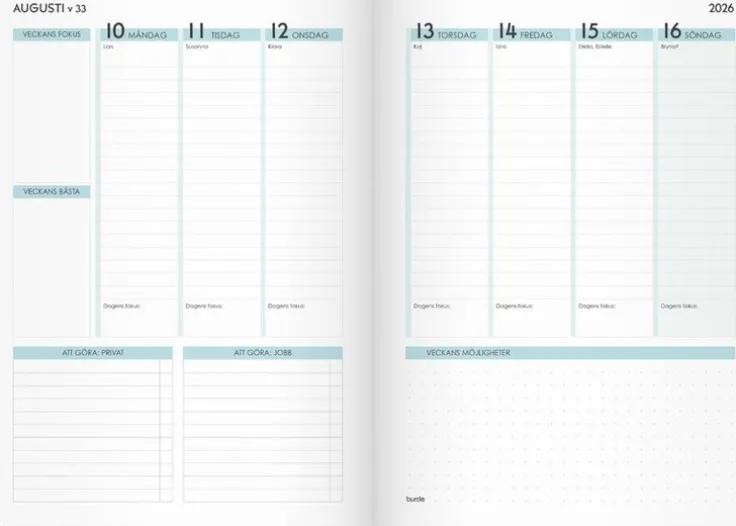 Det är en konst att hitta och behålla fokus! Med Burdes Life Planner Focus får du hjälp att planera det som ska göras i vardagen och på jobbet. Genom att ägna lite mer tid åt din planering kan du bli mer effektiv och hitta tid för det du vill fokusera lite extra på. Kalendern har mjukt kartongomslag med vecko- och månadsplanering.>Kalender 2026 från Burde. Format: A5. Layout: Stående. Vecka/uppslag. Kalendarium: 2025-12-15 – 2027-01-03. Omslag: Kartong. Inbunden. Detaljer: Gummiband. Märkband. Innehåll: Flaggdagar, helgdagar/aftnar, månfaser, namnsdagar, temadagar/händelser, årsöversikt/årsöversikter, årsplan/årsplaner,. Antal sidor: 160. Miljöinformation: FSC®.
