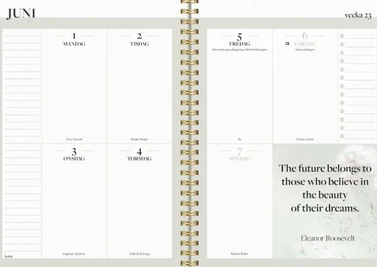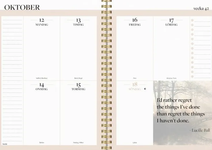 En inspirerande A5 veckokalender som genom citat påminner dig varje vecka om det värdefulla i dig och din tillvaro. Gott om utrymme för veckans planering och reflektioner. Du kommer bära med dig en skön känsla tack vare vackra bilder och milda färger. Stående layout med en ruta per vecka som du antingen kan skriva eller beskriva dina planer via dina egna små illustrationer.>Kalender 2026 från Burde. Format: A5. Layout: Rutor. Vecka/uppslag. Kalendarium: 2025-12-22 – 2027-01-03. Omslag: Kartong med struktur. Spiralbunden. Detaljer: Gummiband. Flyttbar plastlinjal. Pappersficka. Innehåll: Flaggdagar, helgdagar/aftnar, månfaser, namnsdagar, temadagar/händelser, årsöversikt/årsöversikter, årsplan/årsplaner, anteckningssidor. Antal sidor: 160. Miljöinformation: FSC®.