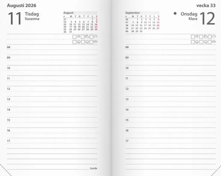Kalender 2026 från Burde. Format: 79×127 mm. Layout: Dag/sida. Timindelning 8-17. Kalendarium: 2026-01-01 – 2027-01-01. Omslag: Konstläder. Inbunden. Innehåll: Kyrkliga helgdagar, flaggdagar, helgdagar/aftnar, månfaser, namnsdagar, temadagar/händelser, årsöversikt/årsöversikter, årsplan/årsplaner,. Antal sidor: 384. Miljöinformation: FSC®.